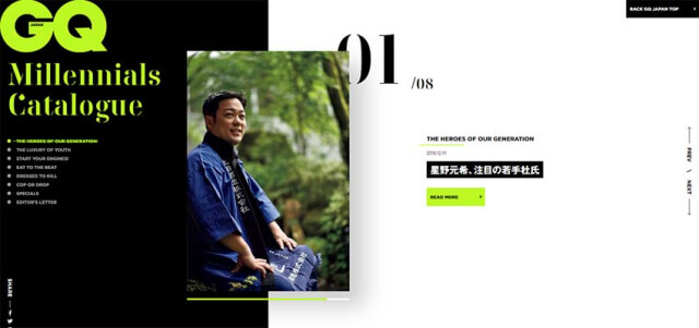GQ日本和機車呈現了一個小趨勢的滑塊,利用不對稱來分屏的概念。從本質上講,該解決方案是基于傳統的垂直分割布局,即左側比右側大。這樣,左側就扮演了一個伴生的角色。你可以在這個區域放置導航,標志,標題等。