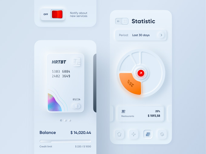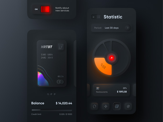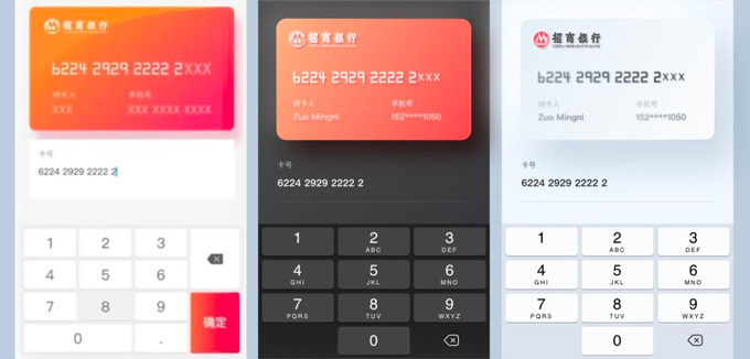 如果將新擬物化全控制使用,確實容易造成界面層級混亂的問題,因為畢竟它的設計語言就是Y軸面不分離的設計定義,但如果我們合理選擇它來作為局部高光,應該大部分情況下還是不錯的選擇。如下圖,我們僅在銀行卡部分使用新擬物化(深淺雙模式均可用),其他的控件部分保持扁平,使用2個風格相融合的方式可以良好保障層級的劃分: