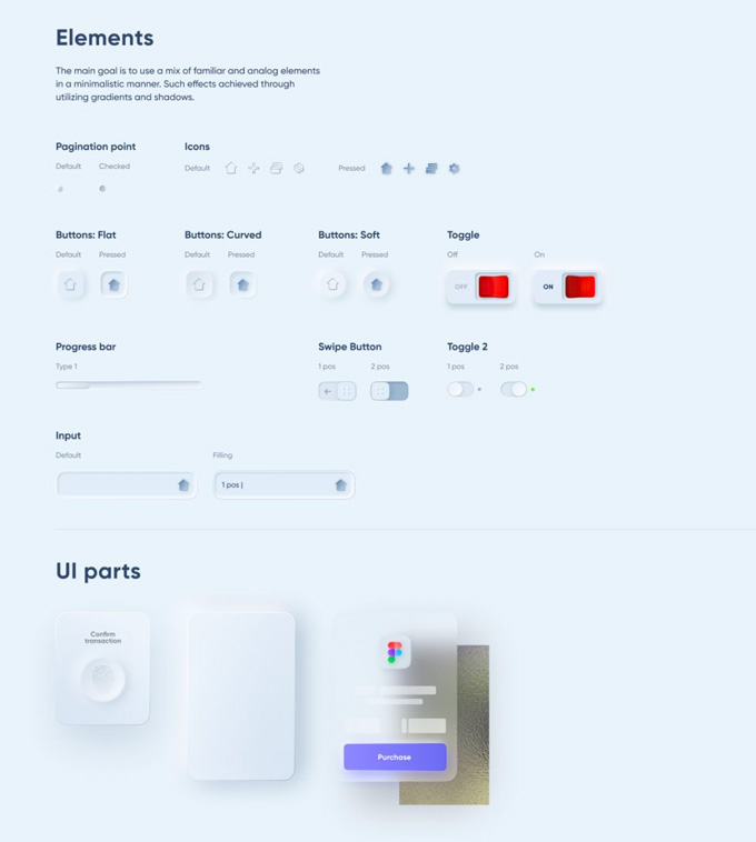 原設計師對新擬物化的“淺色版”控件規范如下,基本涵蓋了核心的界面設計控件,整體對于控件的定義就在于良好使用投影和漸變來打造物理化界面肌理。